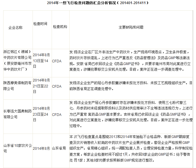 進(jìn)入11月份開(kāi)始,CFDA的飛行檢查力度和密度更大,監(jiān)管趨勢(shì)更嚴(yán)厲。筆者根據(jù)CFDA網(wǎng)站和各省局網(wǎng)站公布的相關(guān)信息,匯總2014年度的飛行檢查情況如下:
